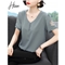 【精选好货】Hizze短袖雪纺衫女2020新款夏装时尚洋气雪纺上衣大码中年妈妈装碎花遮肚小衫T恤夏 浅灰蓝 请拍正确尺码