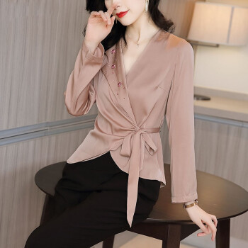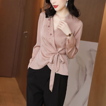 微尚瑶衬衫女2020秋季新款名媛风气质V领系带收腰钉珠上衣女时尚百搭优雅纯色长袖衬衫女7328 粉色 请拍正确尺码 |