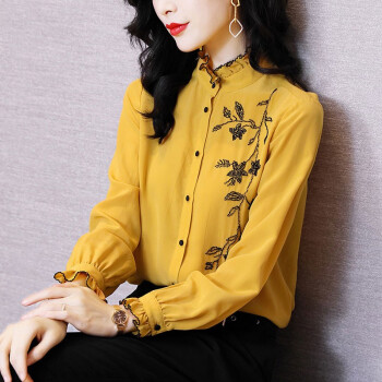 微尚瑶衬衫女2020秋季新款复古优雅荷叶边钉珠长袖立领女上衣气质优雅百搭黄色系扣女上衣6985 黄色 请拍正确尺码 |