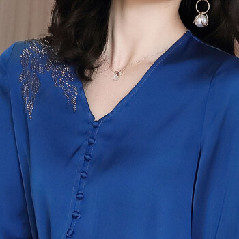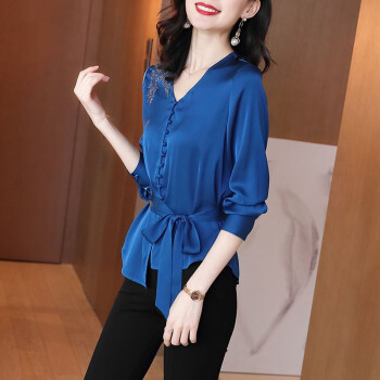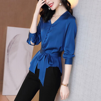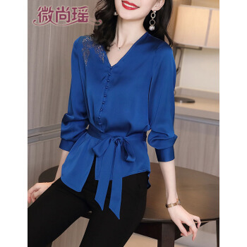 微尚瑶衬衫女2020秋季新款复古港风气质V领洋气系带上衣女时尚百搭纯色休闲长袖衬衫女7331 蓝色 请拍正确尺码 |