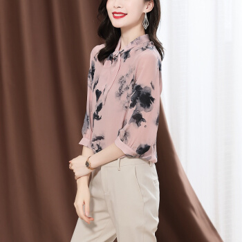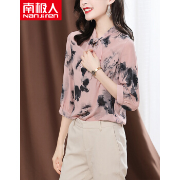 南极人 衬衫女2020夏季新款女装韩版时尚文艺复古七分袖衬衣蝴蝶结水墨印花雪纺小衫上衣潮 N4-NRA25-3001-粉色 XL |