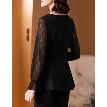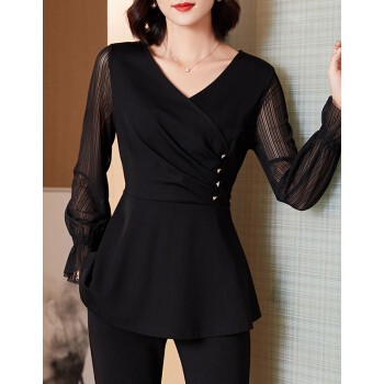 南极人 衬衫女长袖2020夏季新款女装韩版时尚显瘦减龄衬衣洋气设计感上衣网纱拼接V领雪纺小衫 N4-GDB405-6886-黑色 M |