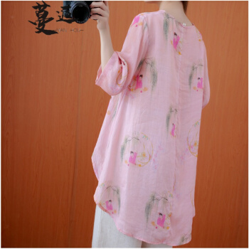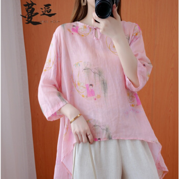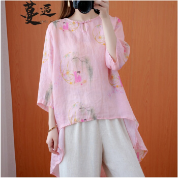 蔓逅 棉麻衬衫女民族风2020夏季新款文艺复古大码女装宽松显瘦中长款不规则遮肚减龄中国风印花小衫上衣 图片色 大码L【建议100-140斤】 |