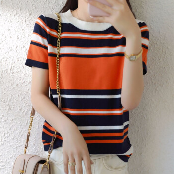 凝拉短袖T恤女纯棉2020夏季新款女装上衣韩版时尚气质宽松大码显瘦圆领拼色条纹针织打底小衫 条纹 2XL(建议130-145斤) |