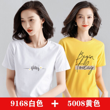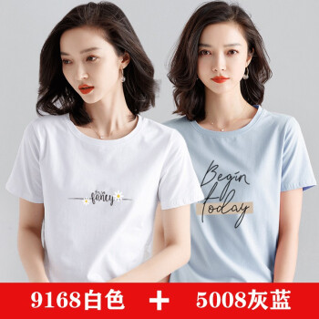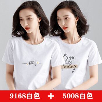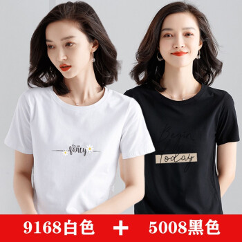 【两件装】知语者女装短袖t恤女宽松体恤大码显瘦上衣2020夏季新款百搭韩版印花时尚纯棉打底衫T恤女 9168白色+5008粉色 L《105-115斤》 |