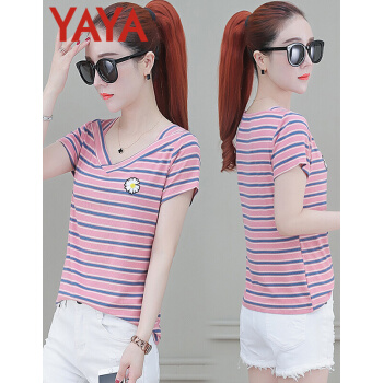 鸭鸭服饰yayaT恤女装夏季新款短袖夏装2020年新款衣服女短款条纹t恤女薄款修身洋气v领上衣 粉条纹 请选择正确尺码 |