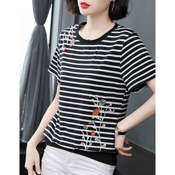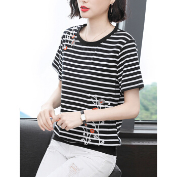【精选好货】韩可思2020夏装新款女士条纹T恤女短袖韩版时尚宽松半袖百搭绣花上衣棉大码体桖夏 条纹 请拍正确尺码 |