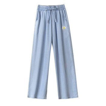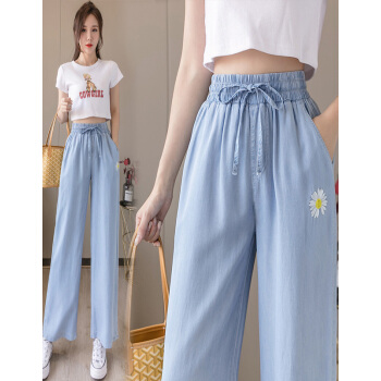 阅樱牛仔裤女冰丝 2020新款女裤夏松紧腰宽松大码休闲牛仔裤女垂感阔腿裤显瘦天丝裤子女薄款拖地裤子女 蓝色 L |
