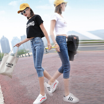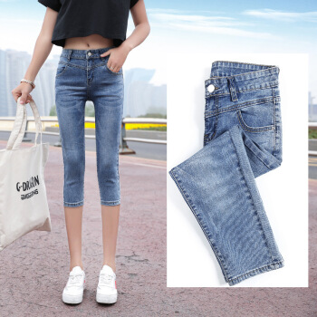 P.E.K.D 2020新款夏季七分牛仔裤女薄款宽松韩版7分裤女弹力修身显瘦中裤 深蓝 28 |