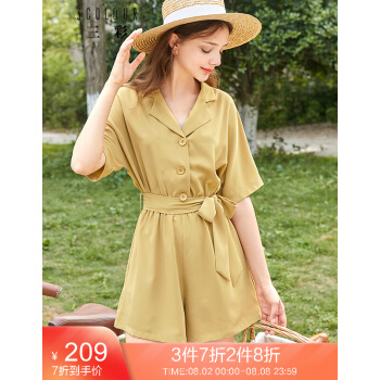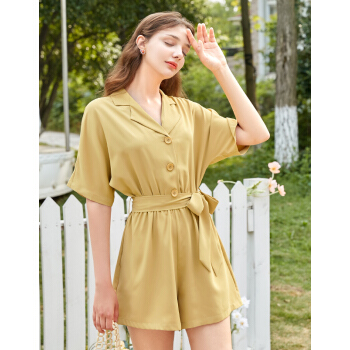 三彩2020夏季新款西装领松紧腰腰带宽松短袖连体裤短裤连衣裤女 黄色 160/84A/M |