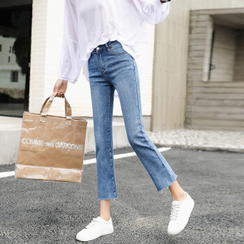 P.E.K.D 2020夏季九分牛仔裤女直筒宽松弹力网红韩版显瘦毛边小个子八分裤 蓝色-九分裤 28 |