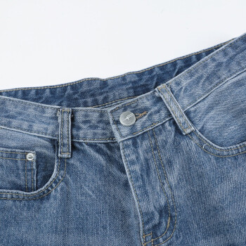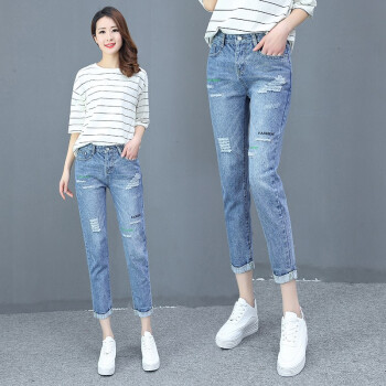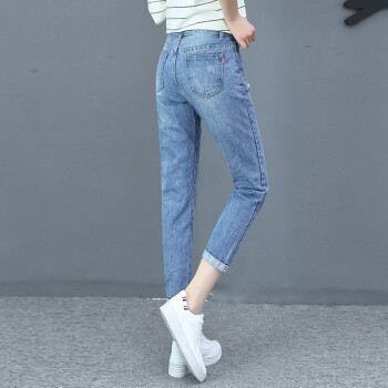 艾比新休闲牛仔裤女2020夏季新款韩版女装宽松高腰显瘦女裤百搭薄款九分哈伦小脚直筒裤老爹破洞裤子潮 蓝色 L |