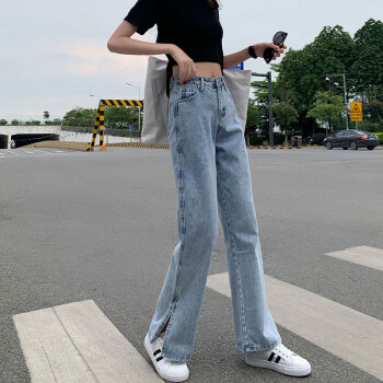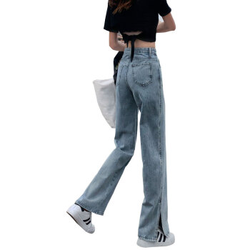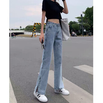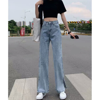 丝克诺依 牛仔裤女阔腿裤夏季薄款2020新款浅色开叉直筒宽松泫雅风高腰垂感拖地裤潮 浅蓝长裤 M |