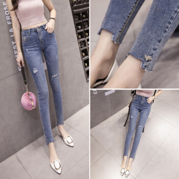 miss nitaly 女士破洞紧身牛仔裤夏季2020新款韩版女高腰显瘦显高铅笔裤修身百搭小脚九分裤 蓝色 M98-110斤 |