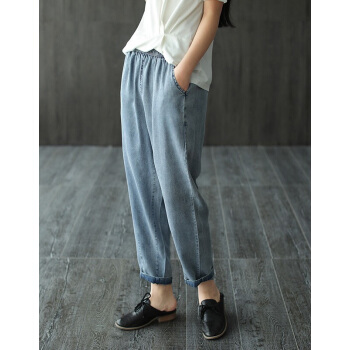 龙芝美 天丝牛仔裤女2020夏季新款复古文艺松紧腰宽松哈伦九分裤女 蓝色 请拍正确尺码 |