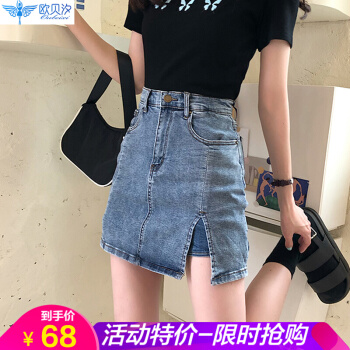 欧贝汐牛仔裙半身包臀裙夏季2020学生高腰短裙开叉半身裙裤女士裙子 蓝色 S |