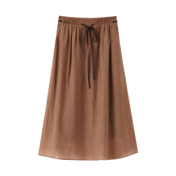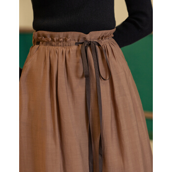 茵曼2020秋装新款时尚苞头中腰撞色系带半身中长裙棉质内衬文艺【F1803779】 浅咖啡 L |