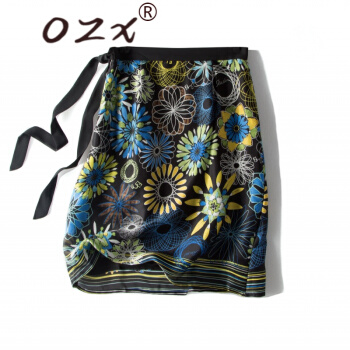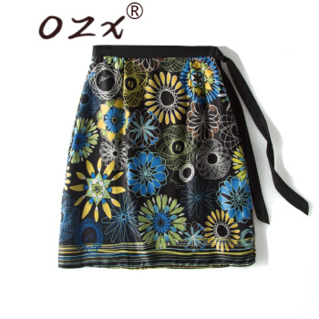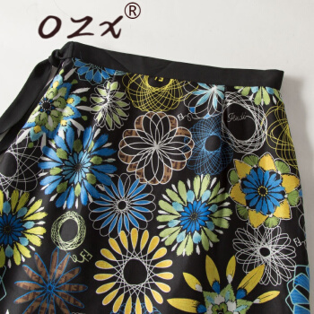 O.Z.X轻奢原创女装真丝半身裙女2020夏新款系带蝴蝶花复古印花桑蚕丝高腰百搭A字裙 黑底印花 L |