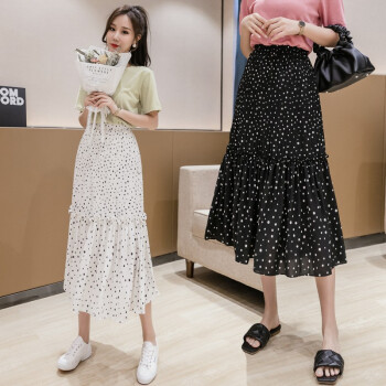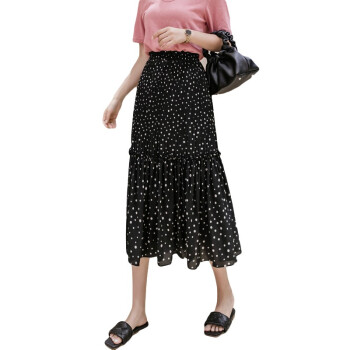 五个橘子半身裙女中长款雪纺裙子2020年新款女装夏季波点裙韩版松紧高腰A字半身裙伞裙蓬蓬裙垂感显瘦 黑色 均码(85-130斤) |