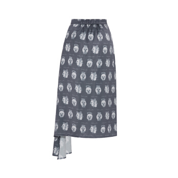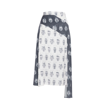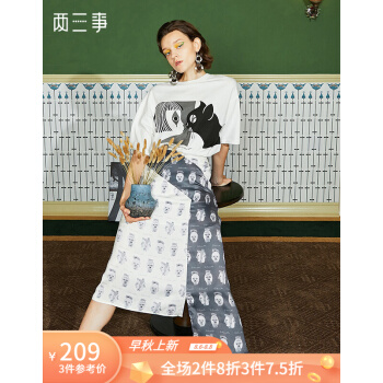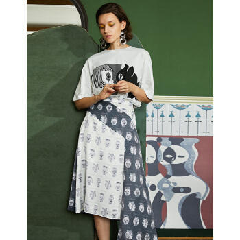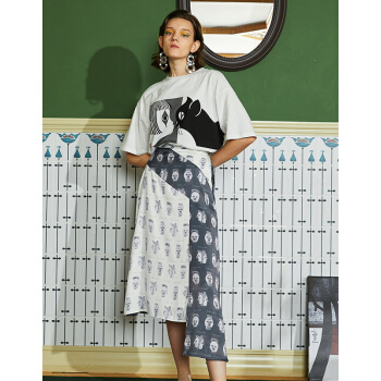 【商场同款】两三事 白日叠影 2020夏季新款复古撞色头像印花不规则高腰半身裙 拼色 M |