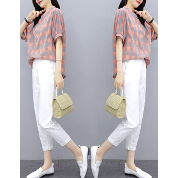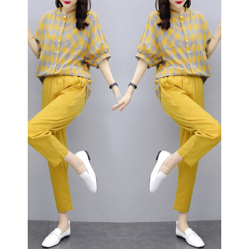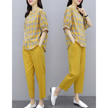 婪澈休闲裤女2020女装夏天新款宽松流行格子中袖休闲棉麻裤子两件套套装女 黄色 请下正确尺码 |