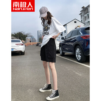 南极人 五分工装短裤女宽松2020年新款夏季薄款高腰百搭休闲裤运动中裤潮ins YYR867 带扣黑色 请拍正确尺码 |