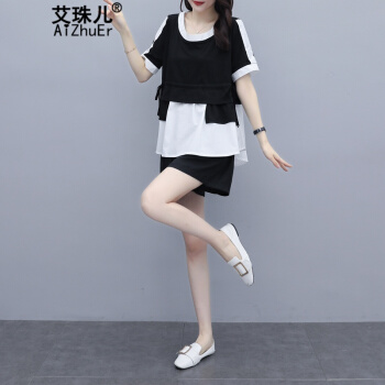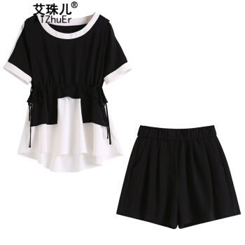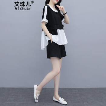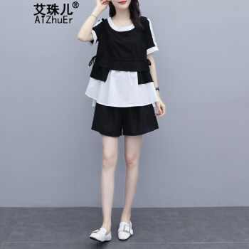 艾珠儿 短裤女2020夏季新款女装休闲运动棉麻两件套大码宽松显瘦阔腿短裤时尚套装女 黑白 短裤套装 M |