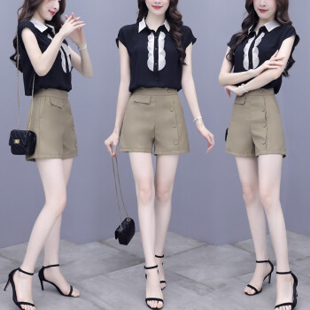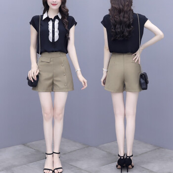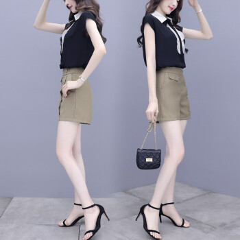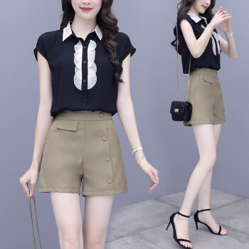 简歆沐 短裤女2020新款夏两件套裤雪纺拼接短袖上衣衬衣短裤休闲时尚阔腿套装女洋气 黑色 S |