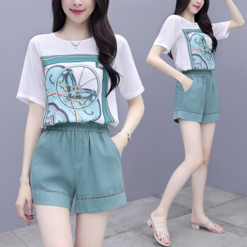 芙萝迪雅 2020新款洋气两件套宽松雪纺上衣配短裤女休闲时尚运动套装女夏 绿色 L |