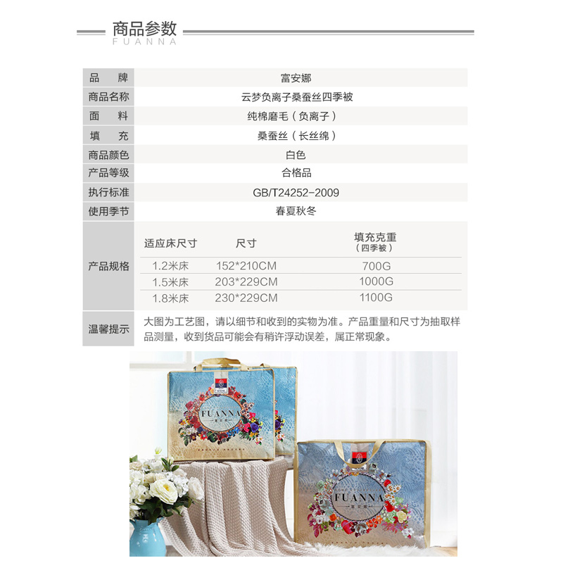 云梦负离子桑蚕丝四季被(被芯1件)(适合1.8米床)【面料:纯棉(含负离子);填充:桑蚕丝(长丝绵)/白】 |