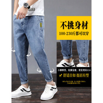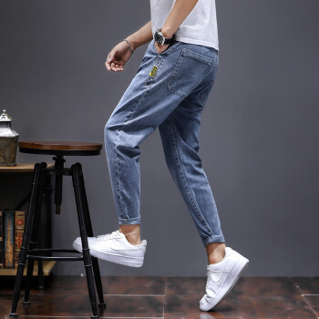 巴迈罗 牛仔裤男士休闲裤男潮牌裤子男新款夏季韩版修身直筒束脚中高腰弹力复古磨透气小脚九分长裤子男 607#浅蓝 31 |