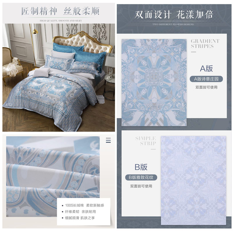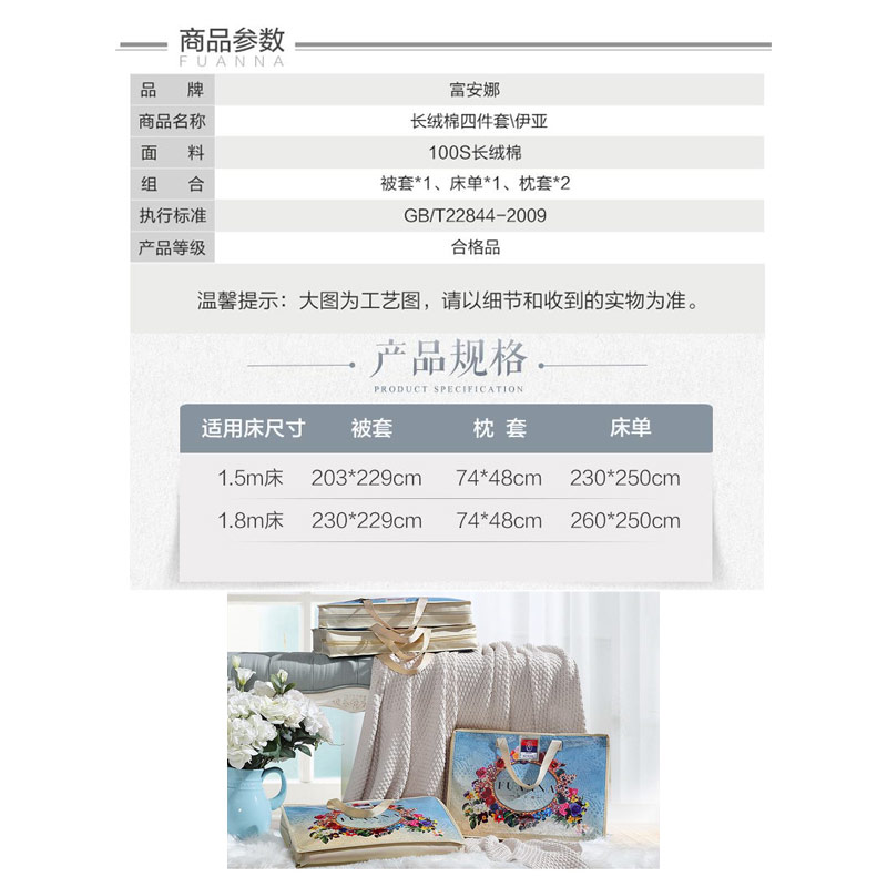 伊亚 床单四件套(被套1件床单1件枕套2件)(适合1.8米床)【100支长绒棉/蓝】 |