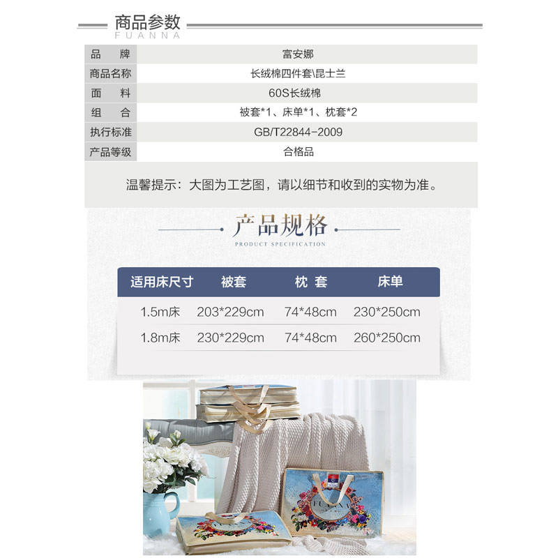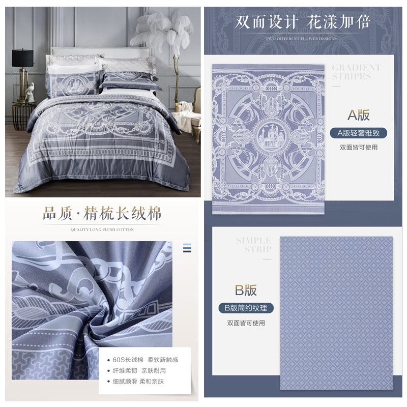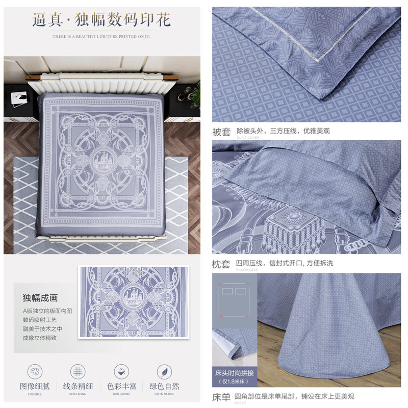 昆士兰 床单四件套(被套1件床单1件枕套2件)(适合1.8米床)【纯棉缎纹/蓝】 |