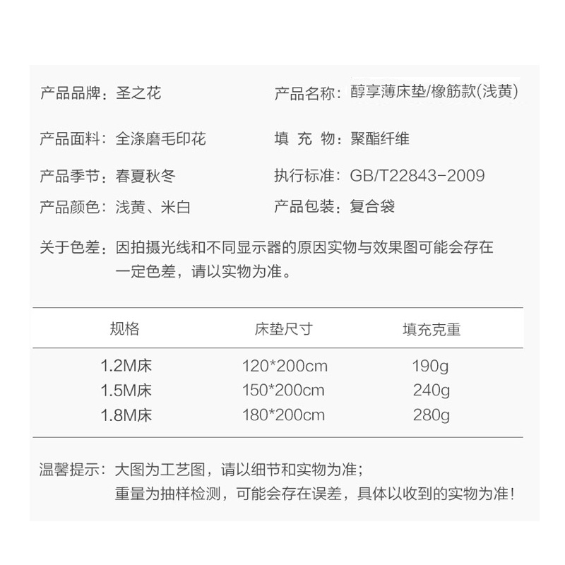 醇享薄床垫 橡筋款(床垫1件)(适合1.5米床)【面料:聚酯纤维;填充:聚酯纤维/浅黄】 |