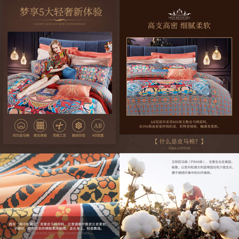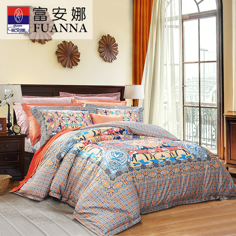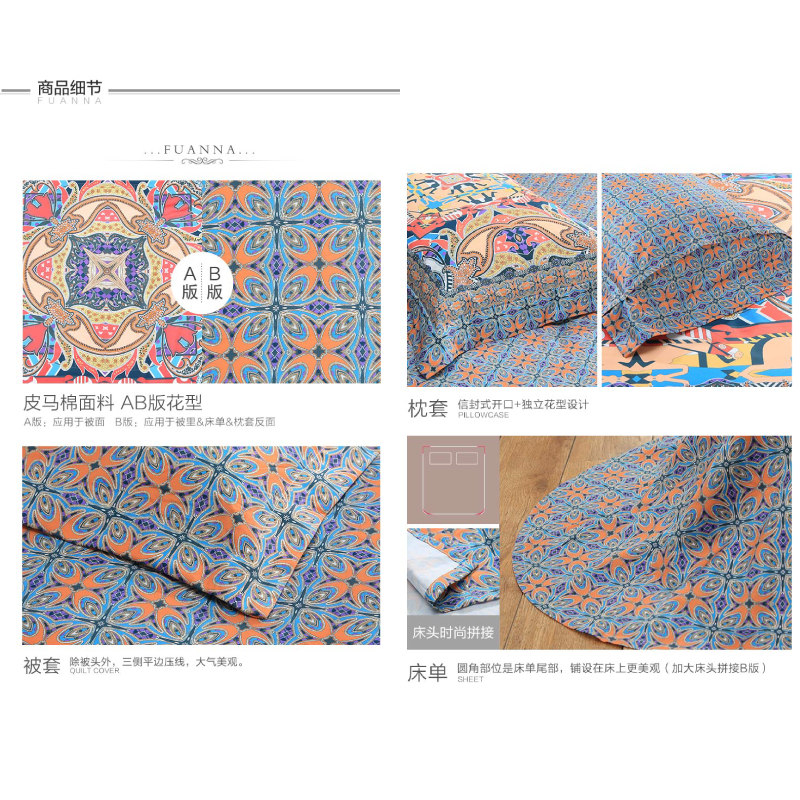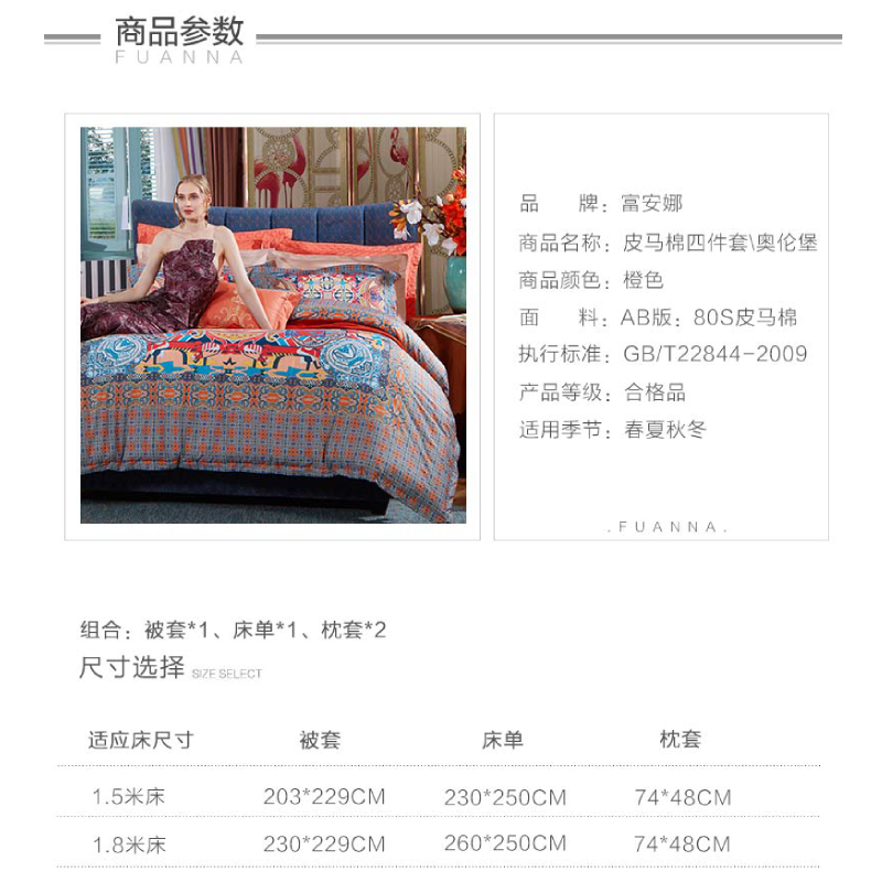 奥伦堡 床单四件套(被套1件床单1件枕套2件)(适合1.5米床)【面料:纯棉80支皮马棉/橙】 |
