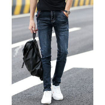 慕思莱牛仔裤男春夏薄款男装男士修身透气潮流长裤韩版休闲弹力破洞小脚裤子男生直筒宽松长裤夏季男裤 02深蓝色 31码-2尺4 |