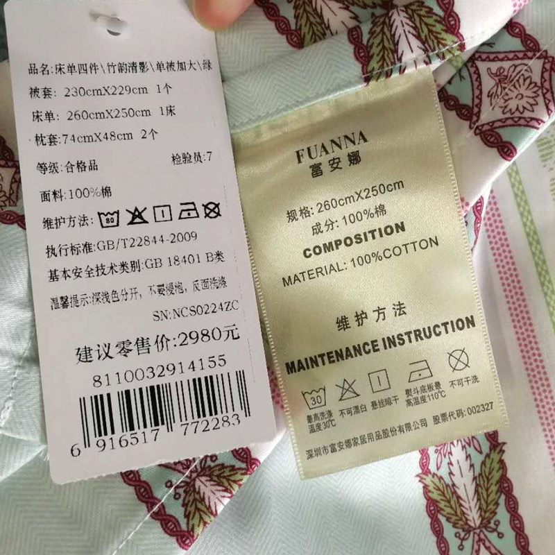 竹韵清影 床单四件套(适用1.8米床)(被套1件床单1件枕套2件)【高支高密棉/绿】 |