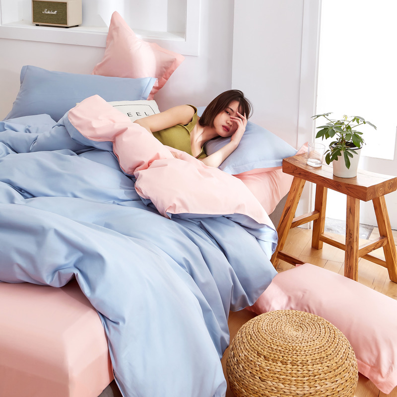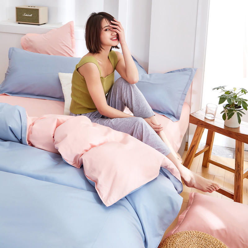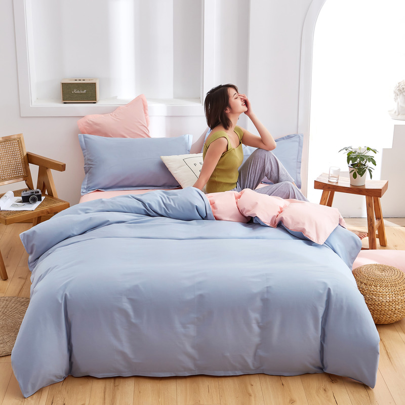 极简时尚双拼全棉喷气四件套【全棉/蓝灰+粉】 |