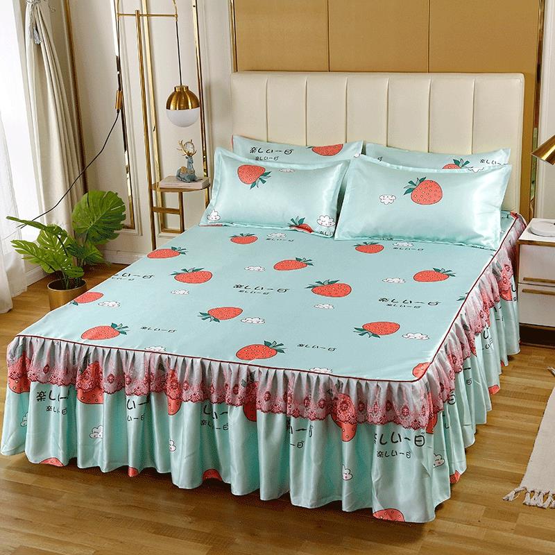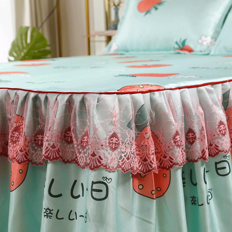 印花蕾丝床裙款冰丝席凉席三件套【冰丝(聚酯纤维)/草莓心语】 |