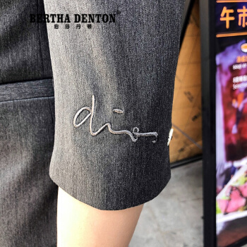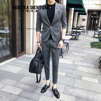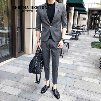 伯莎丹顿品牌夏季短袖痞帅小西装男外套2020新款修身垂感刺绣一套西服潮 中灰色【西装+西裤+黑色T恤】 XL |