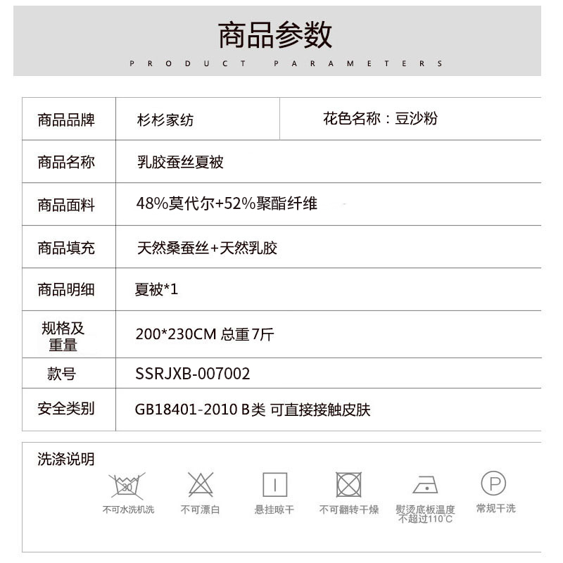 乳胶蚕丝夏被【面料:48%莫代尔52%聚酯纤维填充:天然桑蚕丝+天然乳胶/豆沙粉】 |