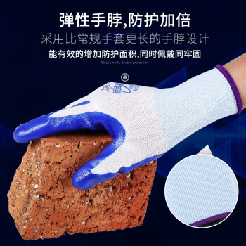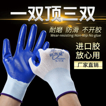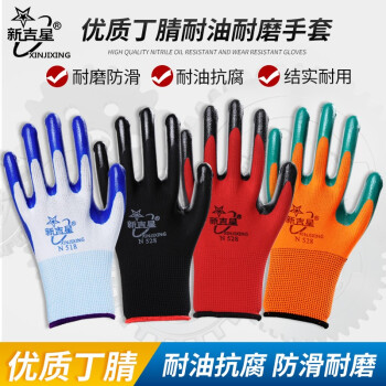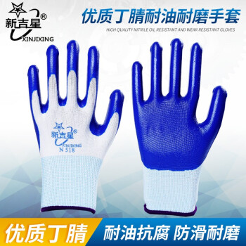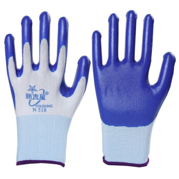 新吉星N518丁腈手套 浸胶涂胶乳胶劳保手套 防滑耐磨透气耐油耐酸碱工地工作干活防护手套N518 (进口胶)新吉星白纱蓝色【12双】 |
