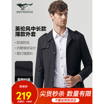 Q3七匹狼风衣男士新款青年中长款时尚商务休闲翻领防风外套 001(黑色)1D1860704849 180/96A/XXL |