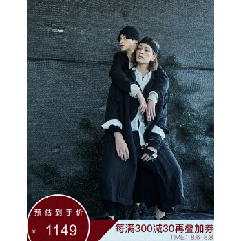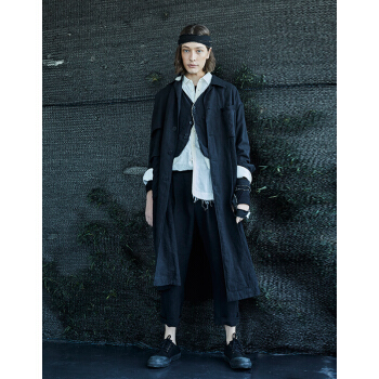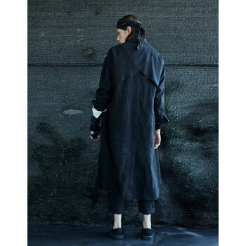 野无风衣男原创设计男装2020秋季新款男士纯色翻领多口袋后背交叉设计长款风衣男潮 粗粝黑 S |