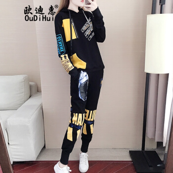 欧迪惠 卫衣女学生2020新款韩版春秋季运动套装女宽松个性时尚气质连帽上衣女休闲两件套潮 黑色套装 M |