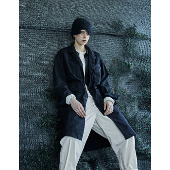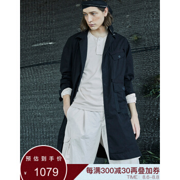 野无风衣男原创设计男装2020秋季新款男士工装翻领长款黑色风衣外套男 粗粝黑 M |