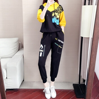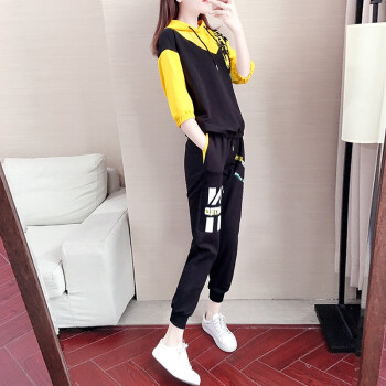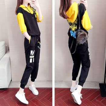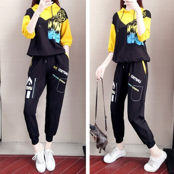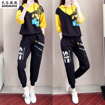 芭芬薇薇运动休闲套装女时尚2020秋季新款宽松七分袖连帽卫衣洋气两件套潮 黑色两件套 S |