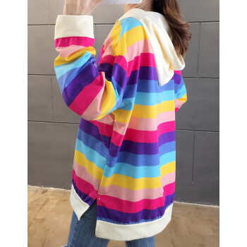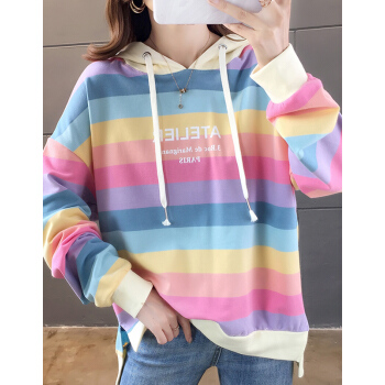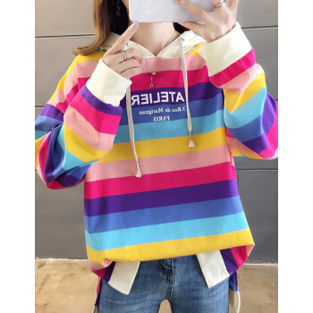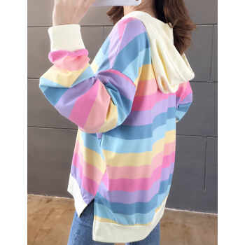 时尚欧陆 卫衣女宽松连帽中长款条纹上衣潮2020春秋时尚套头韩版慵懒风印花学生款长袖嘻哈少女短外套 浅色条纹 L |