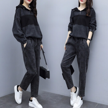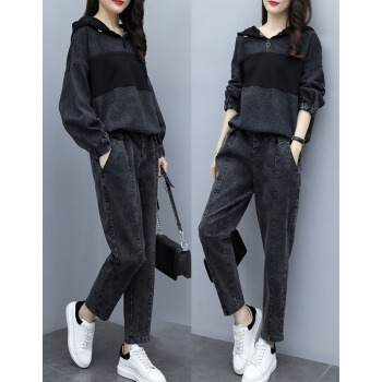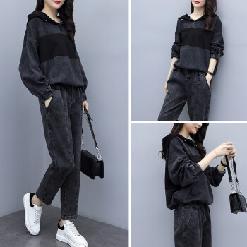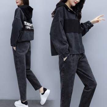 歌卡兰卫衣套装女牛仔2020秋季新品休闲气质显瘦时尚套装女运动服连帽外套女牛仔裤宽松卫衣女2317 黑色 XL |