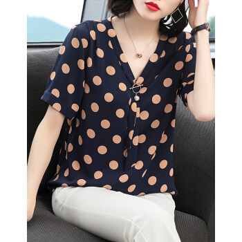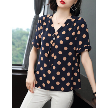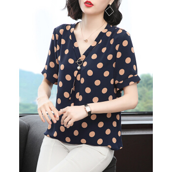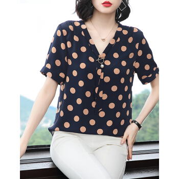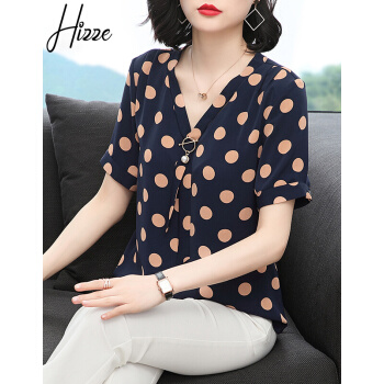 【精选好货】Hizze波点上衣女2020夏季新款雪纺衫中年妈妈遮肚小衫短袖雪纺碎花显瘦衬衫圆点衣服 蓝色 M |
